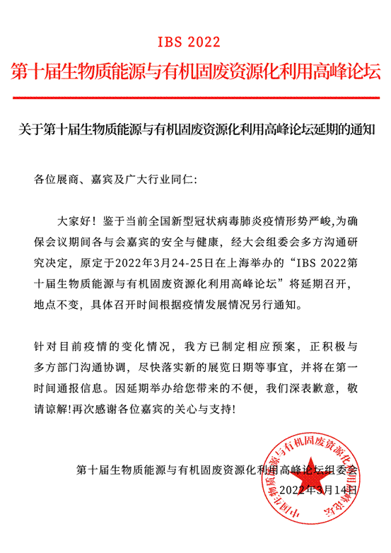 延期通知 |IBS 2022第十届生物质能源与有机固废资源化利用高峰论坛