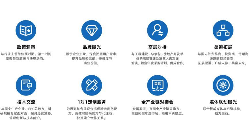 央企及地方总包商参与度高,供采双方对接、采购观展团,特邀EPC工程总承包单位洽谈区内对接。组织以集团为单位的采购观展团。提前登记采购单位拟在建工程项目、工程采购计划需求;提前提供展商展品宣传;现场VIP采购单位宣传册,通过采购方调研反馈,为展商提供更高附加值的专属服务;提前调研采购单位考察供应商意愿,展后按计划有序安排,为展商提供增值服务。